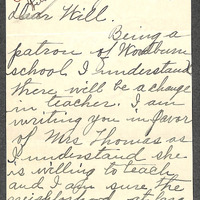 2 individual letters and Petition dated May 19, 1933, in which H.W. Burke informs Will Smith of a change in teacher at the Wordburn school. Mrs. Thomas has been appointed as the new teacher, with the neighborhood showing support for her. In another letter, Mrs. Jenkins expresses support for Mrs. Thomas teaching at Woodburn. The appointment of Mrs. R. Thomas as the teacher for the 1933-34 session at the Woodburn school is confirmed by signatures from various individuals.